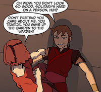 Every bit she entered her cramped lonely prison cell, Suki assured herself that she was not lonely. She was released after ii weeks and talked to her allies, who informed her that Biyu had been removed from the general population and had been given a special cell and certain privileges. Suki grew aroused and rhetorically asked what Biyu had said to gain such privileges, to which nobody replied. Spotting Biyu heading back to the jail cell, she scaled the walls of the prison and rushed inside, knocking Biyu to the floor and declaring her a traitor. Biyu did not deny doing so, noting that she had to wait out for herself. Suki asked about the others and the plan to build upwardly their strength to escape; Biyu responded that the programme was not hers, and although she thought that the plan was smart, she realized she did not need to be in such danger afterwards the fight in the cafeteria. Suki angrily stated that Biyu had betrayed her fellow prisoners to the Burn Nation subsequently they tried to stand to them, and asked Biyu if she had any loyalty. Biyu said that, unlike Suki, she did not care about community, and only needed to get through her judgement in as much comfort as possible, saying that she would choose the warden over Suki as he owned the prison. Biyu chided Suki for believing that they were friends; in her anger, Suki lurched toward Biyu and threatened to throw her over the railing. As Biyu began to panic and apologize, Suki threw her back onto the floor and walked away, while Biyu taunted her for being a coward if she only wanted to scare her.