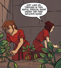 Suki went for her meal fourth dimension, only to be served a bowl of slop. She overheard an World Kingdom thief named Biyu complaining nigh the horrible quality of the nutrient, only for a guard to tell her not to consume the food if she did not like information technology. Suki introduced herself to her fellow prisoner, only to exist told that she would only talk if Suki had food. Suki asked that they introduce each other first, and then gave Biyu a few of the dumpling weed plants. She brought the prisoner to a spot in the courtyard where she had seen the constitute growing, and after grabbing a few pods from the plant, the other prisoner brought her to a blind spot where the guards could not see. Fifty-fifty though Biyu wanted to have a meal, Suki encouraged her to agree to planting some seeds and so that they could abound a stash of food and share it with the other prisoners then that they could work together and notice a chance to button back against the Fire Nation.