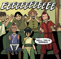 - Suki is the just member from the original Team Avatar not to have made an appearance nor been mentioned in The Legend of Korra outside of the first episode'south opening sequence, which depicts the team in its entirety.